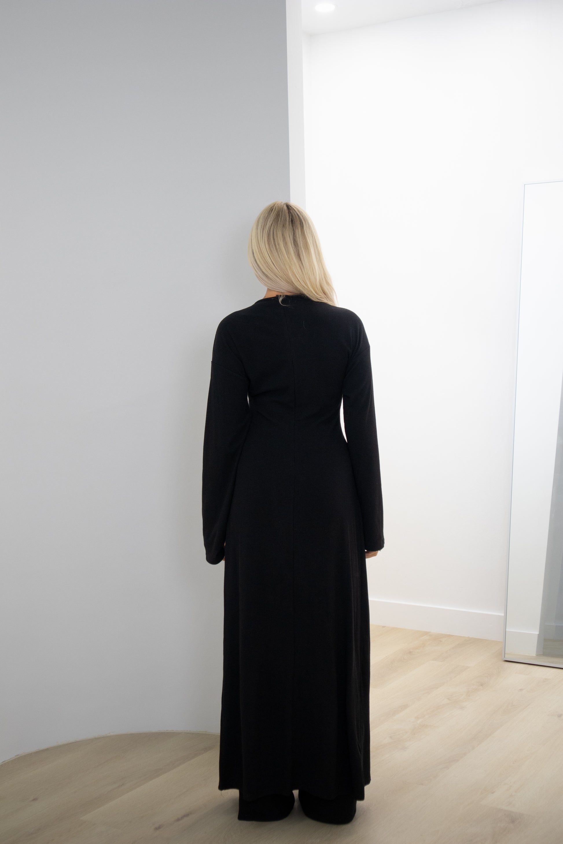 The top features an elongated silhouette with a clean round neckline, subtle front pleating, and an invisible zipper at the back for a seamless close. The matching pants are cut wide with an elastic waistband, allowing for a flexible, comfortable fit that adjusts to your waistline without compromising shape.