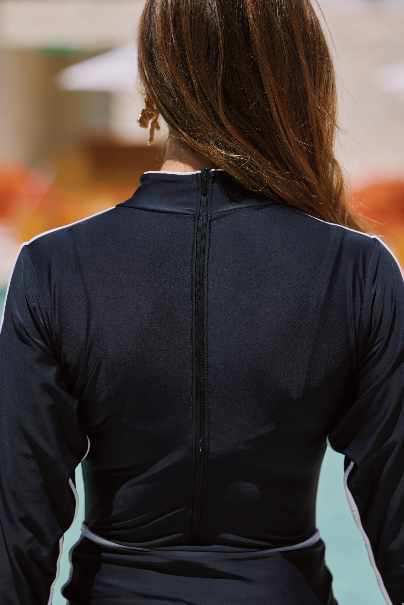 Piece 1 – The Bodysuit A form-fitting bodysuit featuring a high neckline and a smooth back zipper for easy wear. The sleeves include thoughtful thumb openings to keep them securely in place, which can be transformed into elegant split cuffs simply by undoing the small button closure. The bodysuit is finished with functional button fastenings at the base for comfortable convenience.