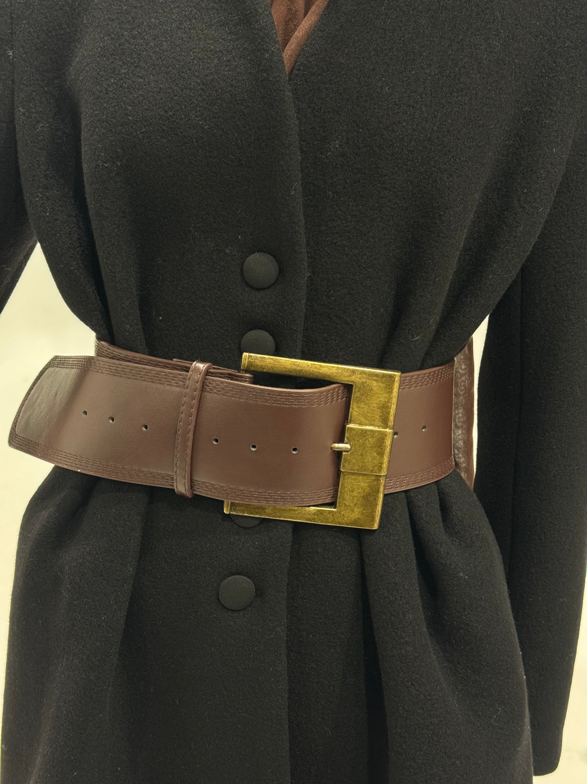 A bold accessory designed to command attention. The Sculpted Square Belt features a wide chocolate brown strap paired with a striking oversized antique gold buckle — giving structure and statement to any outfit. Whether layered over a coat, blazer, or dress, this belt instantly elevates your silhouette with a touch of vintage flair and modern strength. Made for the woman who leads with presence.