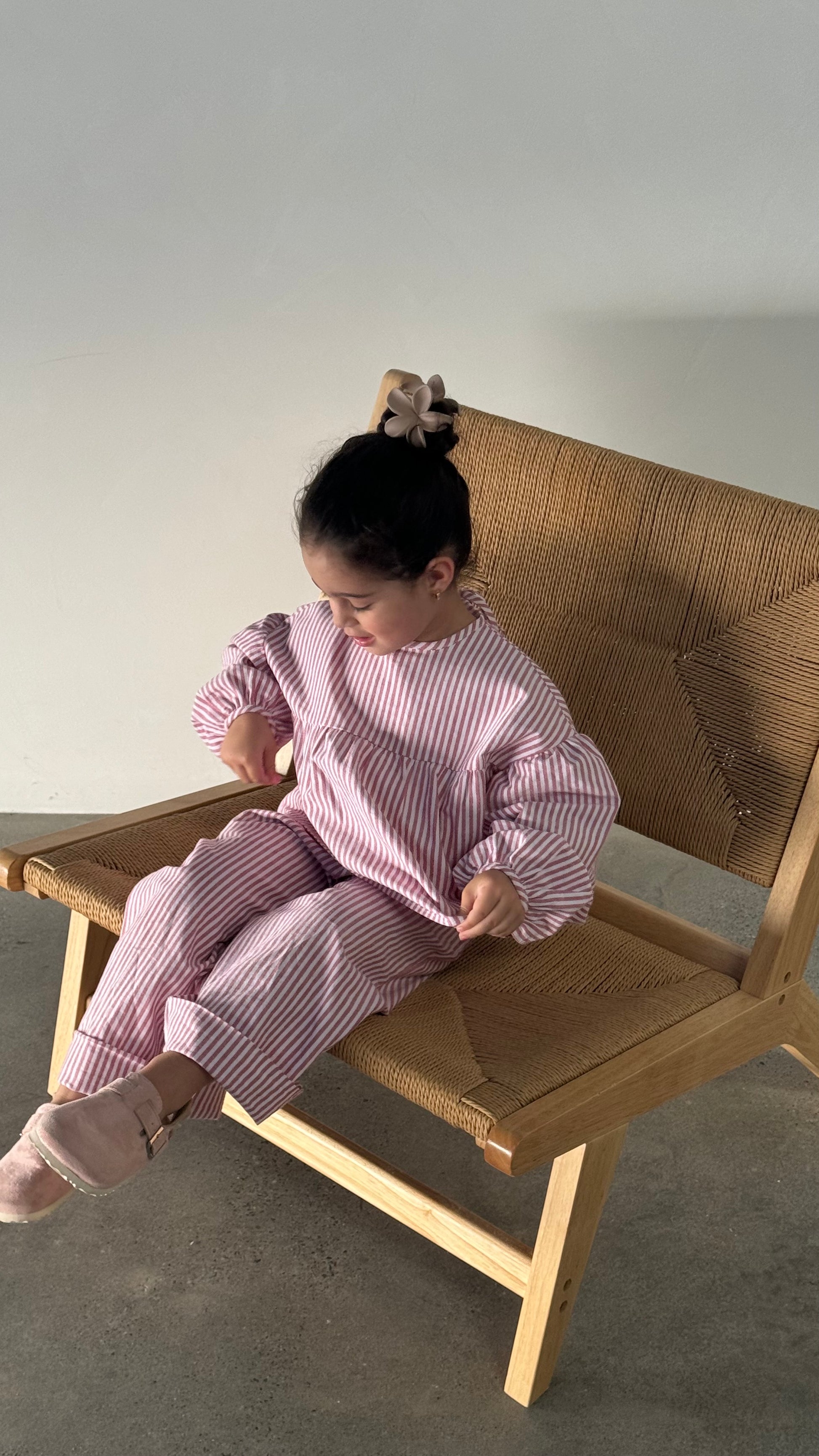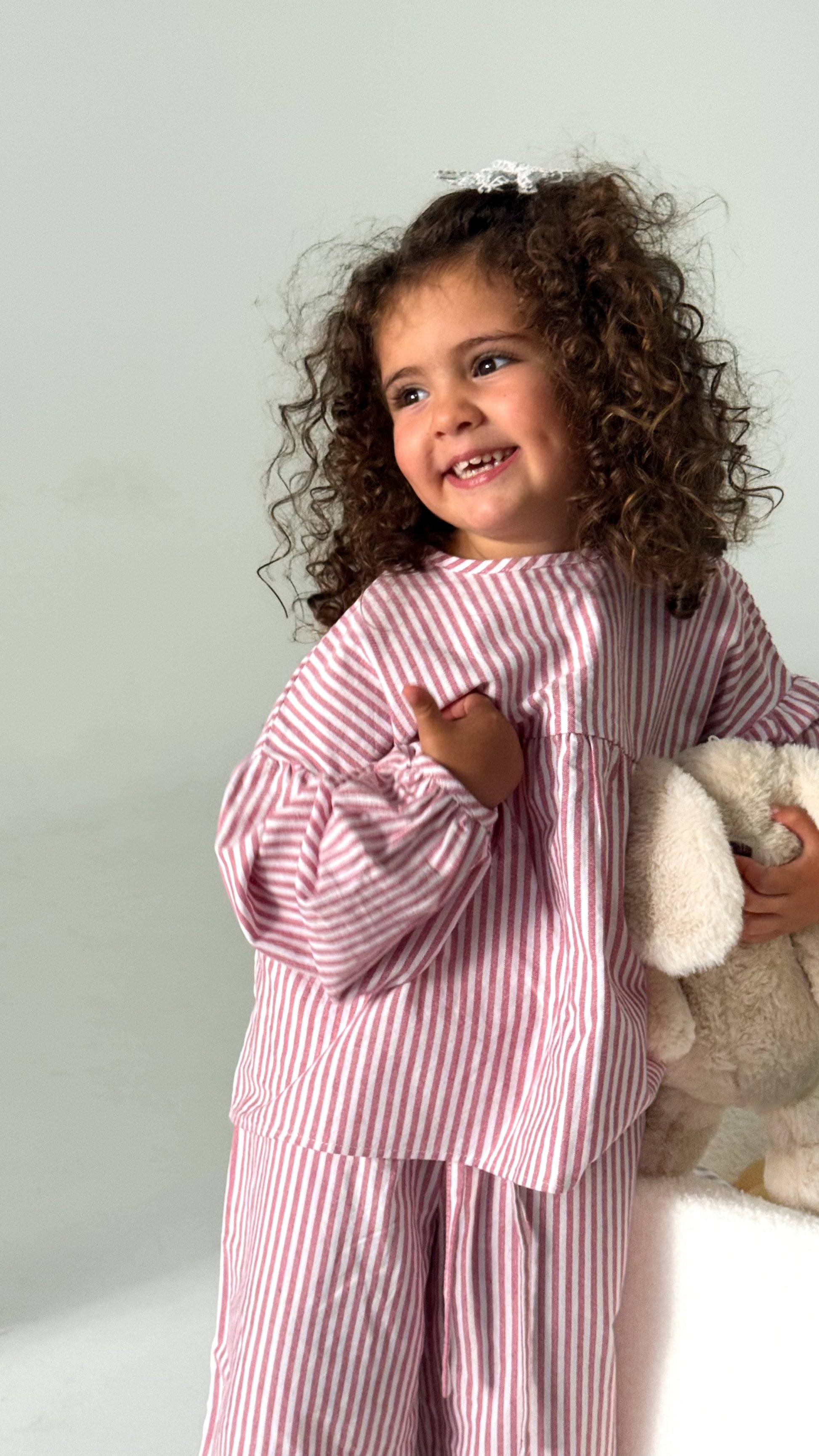 Crafted from 100% cotton, the Liyaana Set is designed for comfort and ease without compromising on charm. The top features a relaxed, slightly A-line silhouette with gathered cuffed sleeves for a soft, voluminous touch. At the back, a delicate tie detail allows it to be fastened into a sweet bow. The matching pants are finished with an adjustable drawstring waist and handy side pockets, making them as practical as they are adorable. A timeless striped set made for playful days and cozy moments.